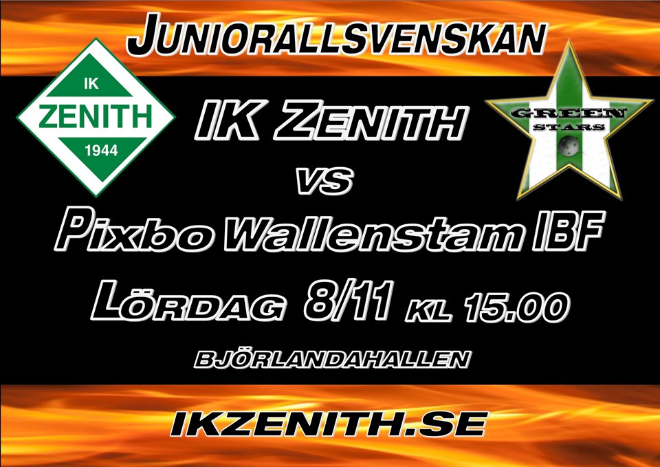 Nu på lördag kl 15.00 spelar Zeniths Juniorer hemma mot Pixbo Wallenstam i årets upplaga av Juniorallsvenskan. Pixbo är ett mycket bra lag och Zenith är taggade för att ta sin första seger, så vi kan utlova en kamp utöver det vanliga. Kom ner och hjälp våra killar, dom behäver Ert stöd! Välkomna ner till Björlandahallen!