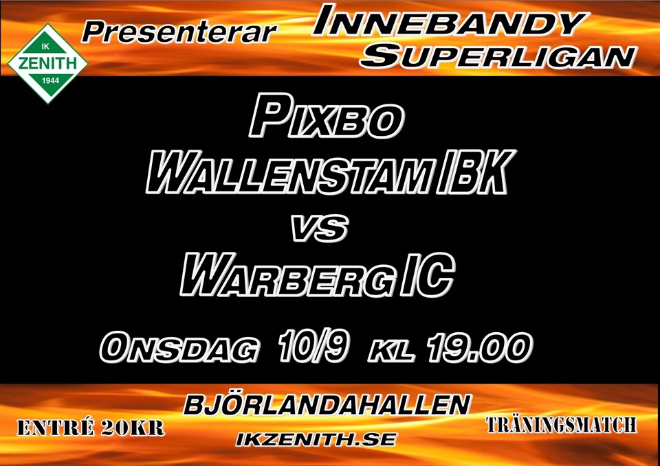 På onsdag 10/9 kl 19.00 spelas det träningsmatch i Svenska Superligan mellan Pixbo & Warberg. Arrangör: IK Zenith Kom i tid eftersom det kan bli fullsatt! IK Zenith 3 sep 2014 0kommentarer